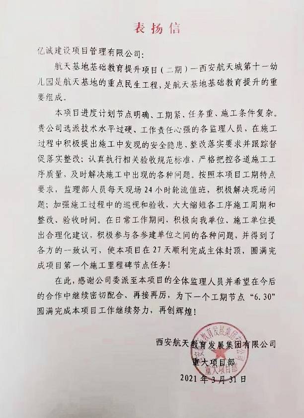 為表彰先進、交流經驗、切實加強與各單位的良好合作關系,3月23日,陜西省西咸新區(qū)空港新城安居置業(yè)有限公司(以下簡稱:空港安居置業(yè))對合作單位進行了表彰,億誠建設項目管理有限公司被授予“優(yōu)秀造價咨詢單位”。